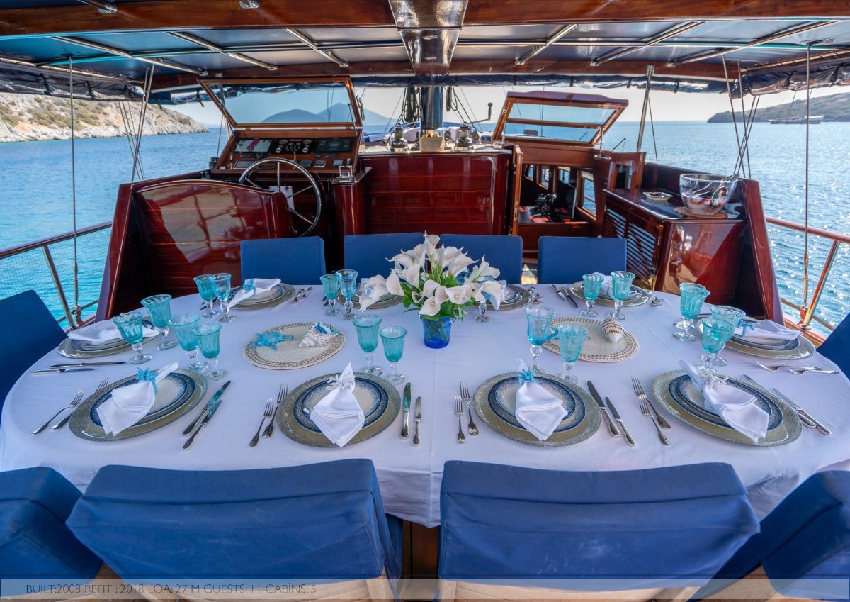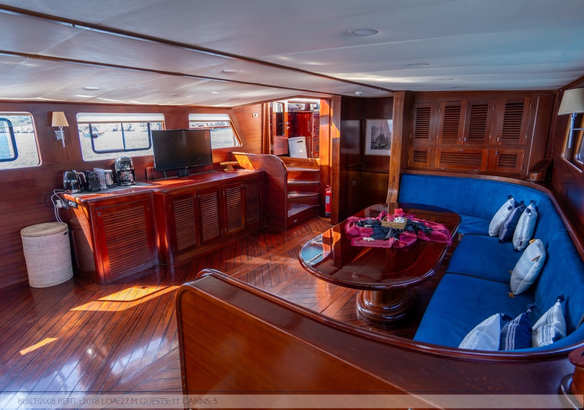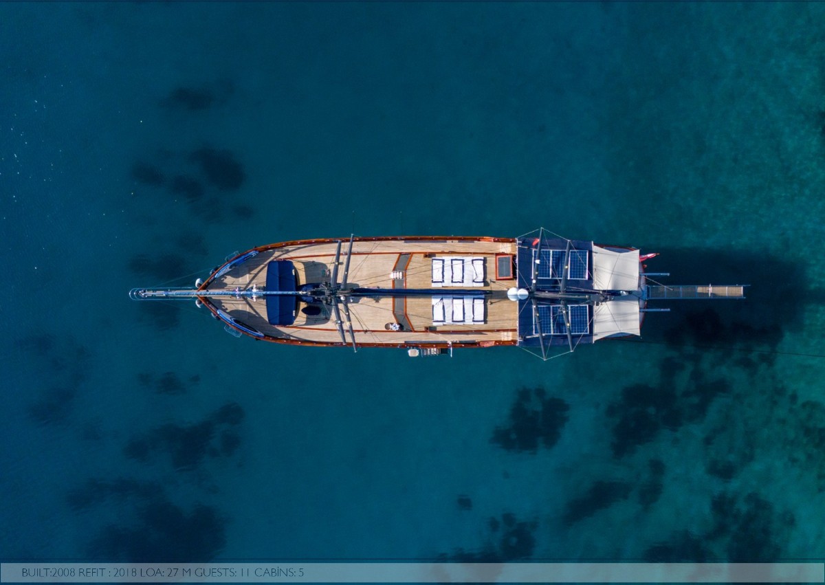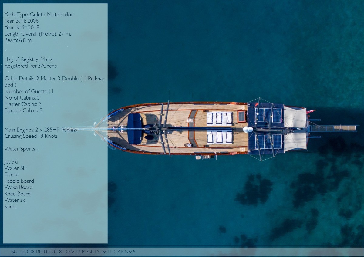 Capricorn 1 is a fully equipped luxury gulet available for yacht charter in Turkey, ideal for cruising Bodrum, Göcek, Marmaris and the Turkish Riviera.She accommodates 10 guests in 5 cabins (2 Master, 3 Twin – one with convertible bunk), all with ensuite bathrooms, home-style toilets, and shower cabins. Each cabin features satellite TV, air conditioning (including night use), and 220V electricity for full onboard comfort.The yacht offers a spacious salon with bar, indoor dining area, comfortable... click to view more...