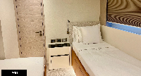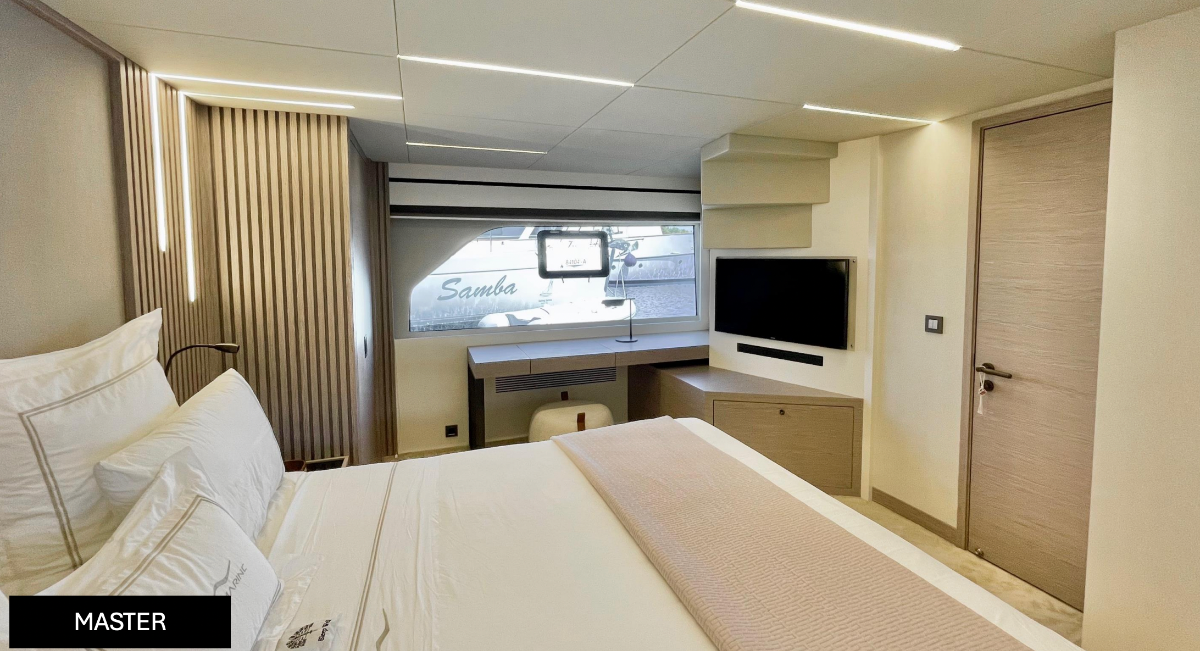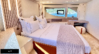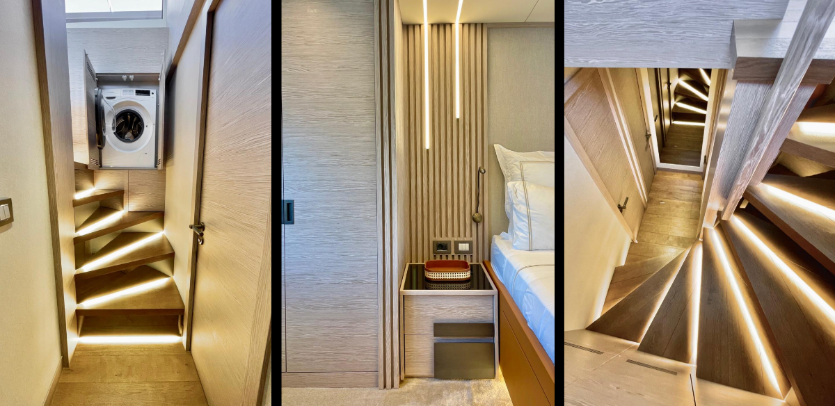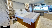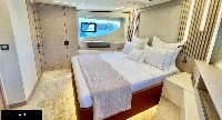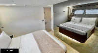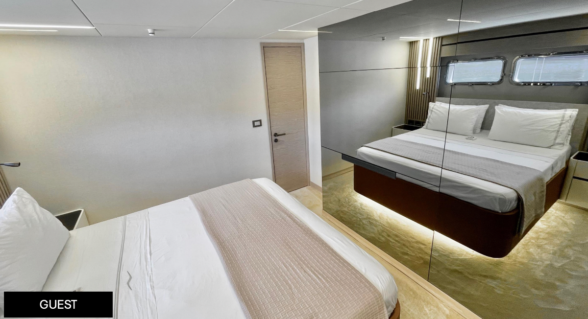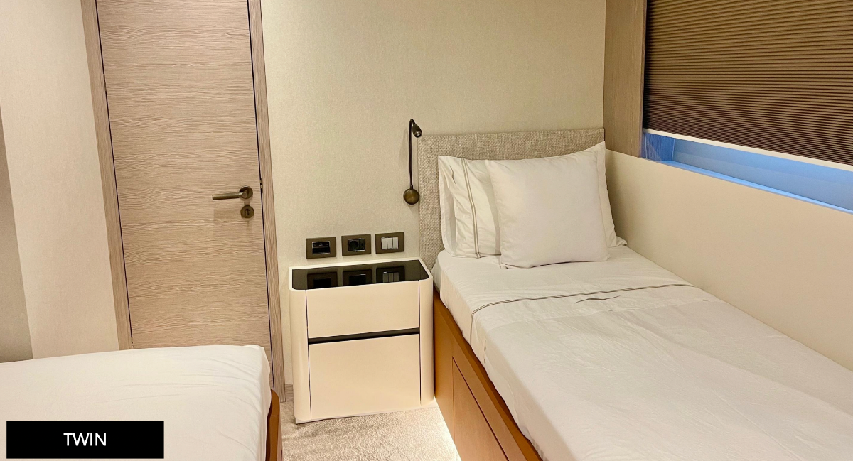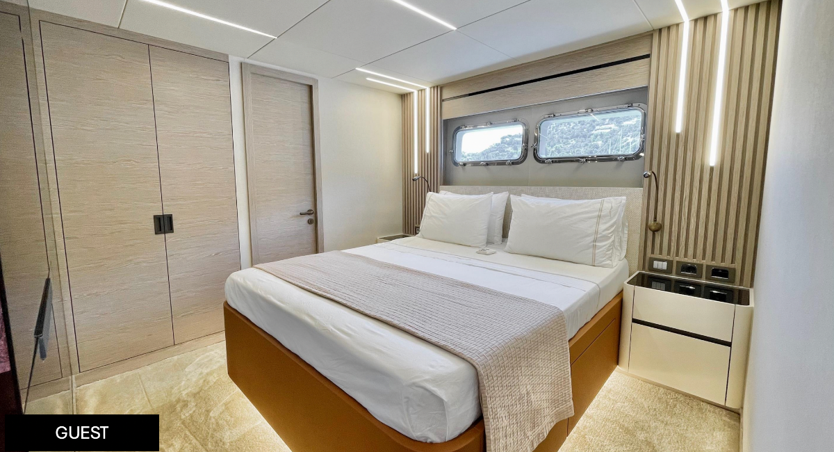 Lower deck VIP cabins located amidships for maximum stability and volume, it features expansive windows, ample storage, and refined finishes.