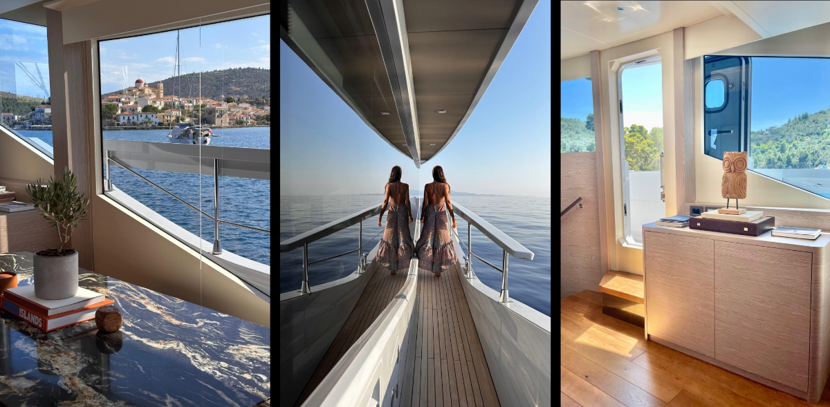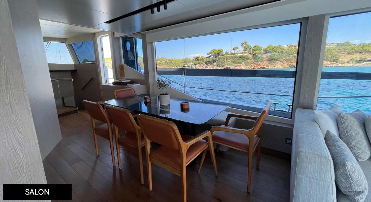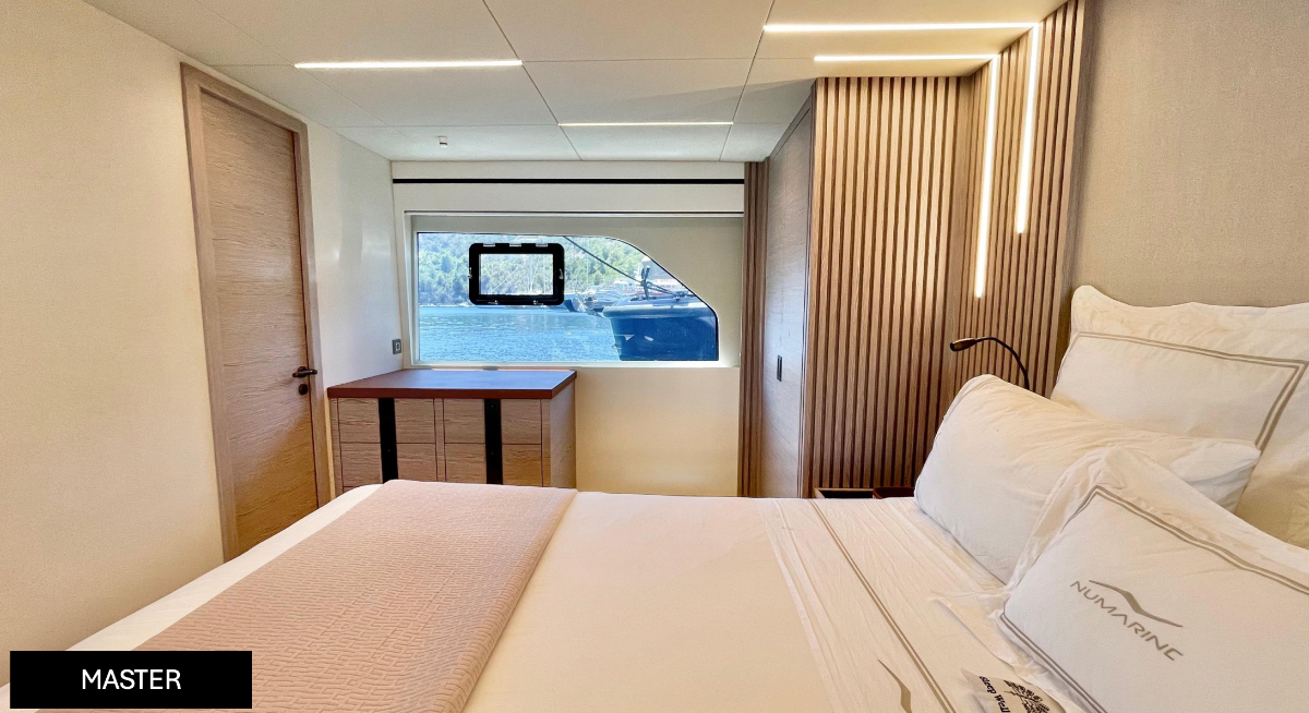 Owner's cabin with panoramic sea views and minimalist luxury is a full-beam sanctuary.