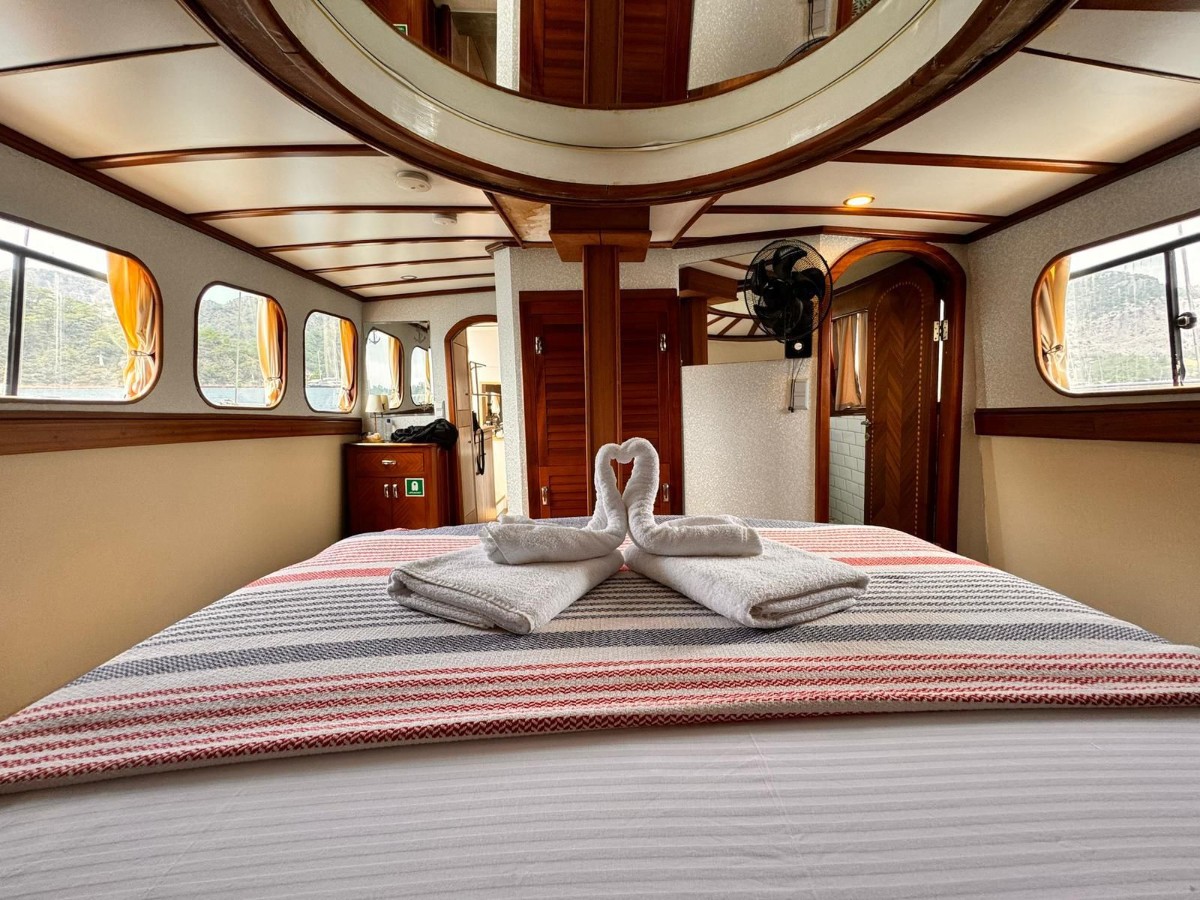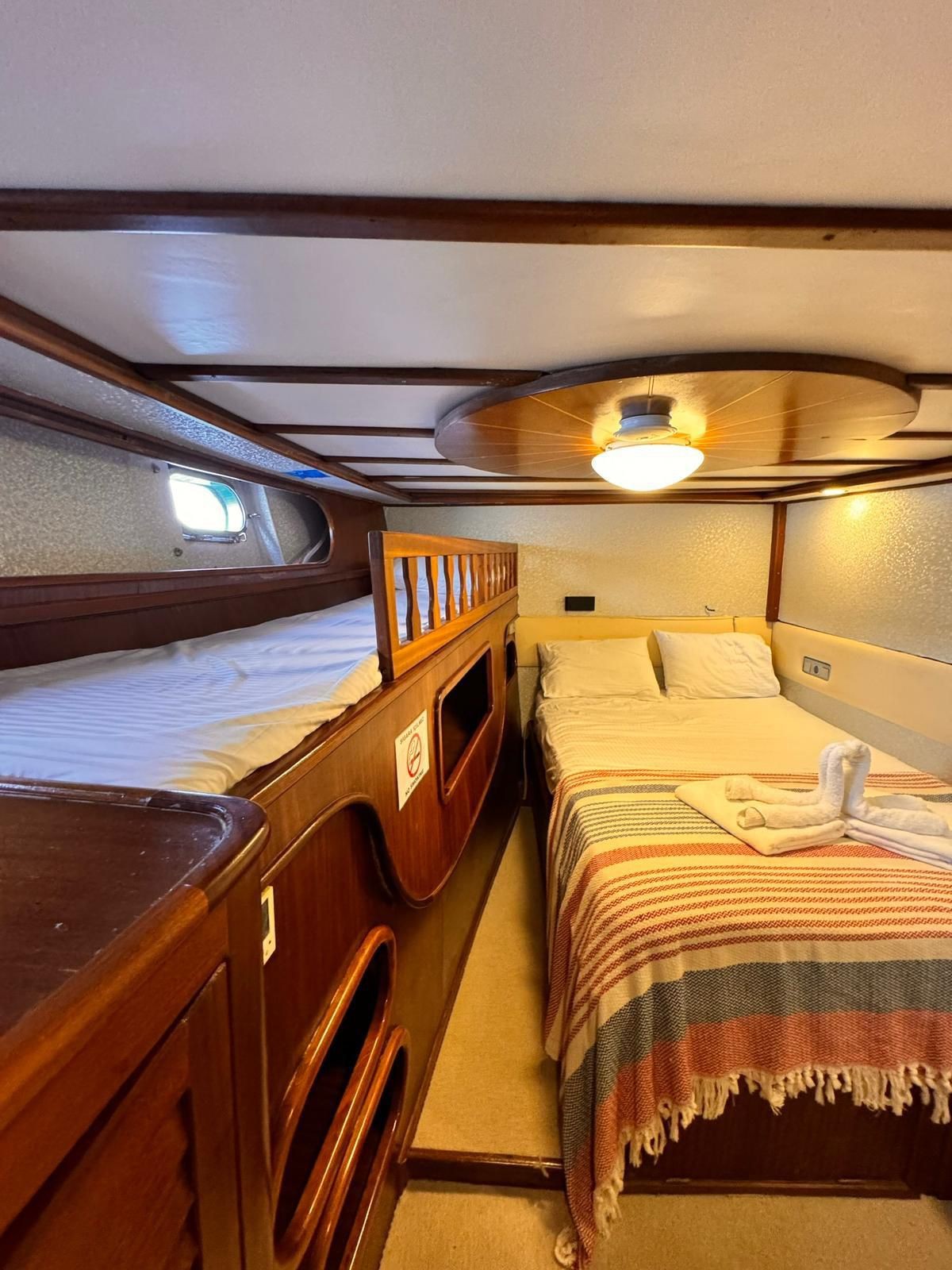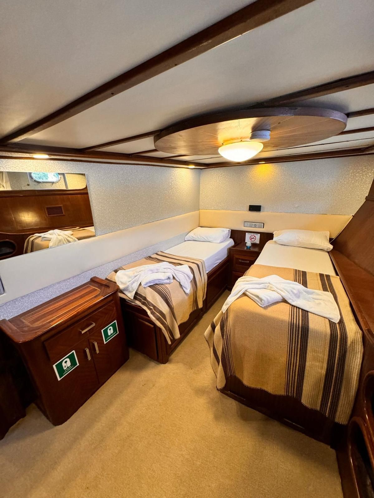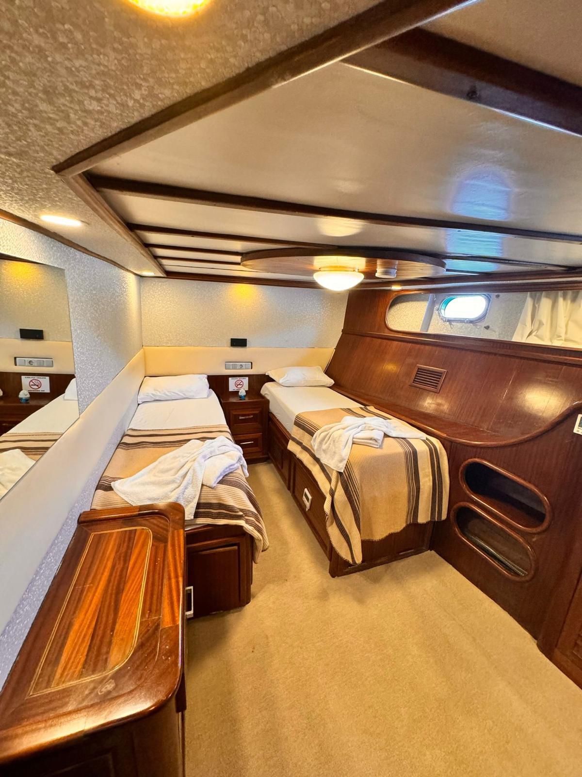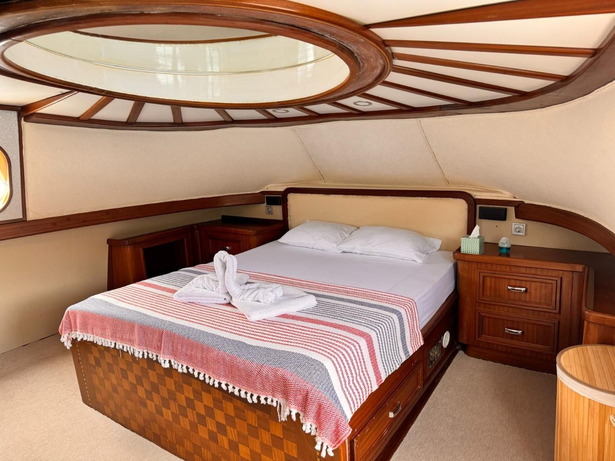 Teknemiz, 2 master ve 2 double olmak üzere toplam 4 geniş kabinde 10 misafire kadar konaklama imkanı sunmaktadır. Yüksek tavanlı, ferah ve modern bir dekorasyona sahip olan kabinlerimizin tamamı klimalıdır. Hijyen konusundaki hassasiyetimiz gereği tüm yaşam alanları büyük bir titizlikle dezenfekte edilmektedir. Konforunuzu tamamlamak adına banyolarımızda duşakabin ve elektrikli marin tipi tuvaletler standart olarak yer almaktadır. Mürettebatımız için ayrılmış özel kabinler, misafirlerimizin mahremiyetini en üst düzeyde tutmaktadır.
