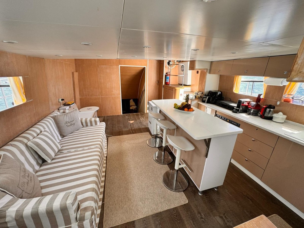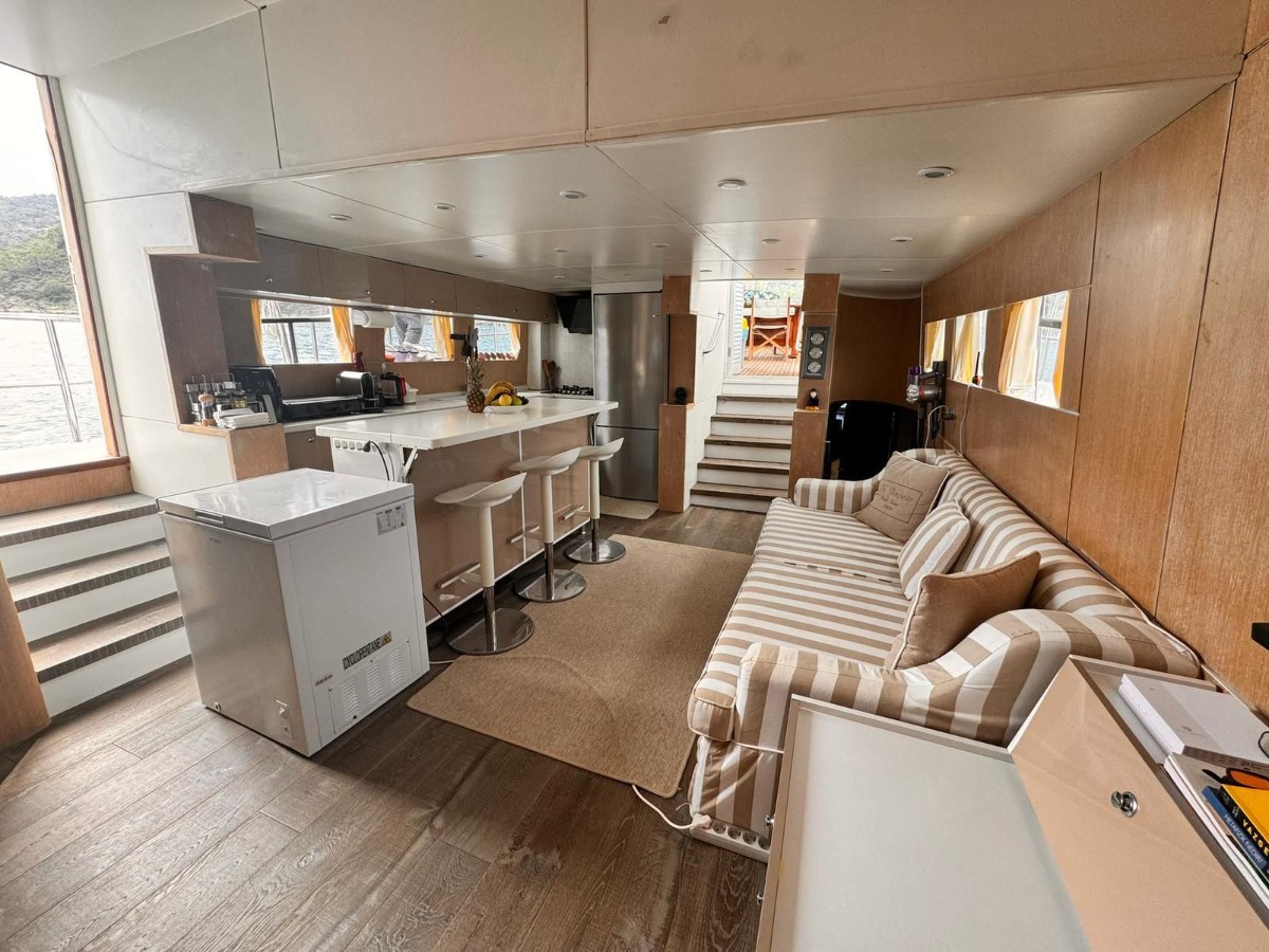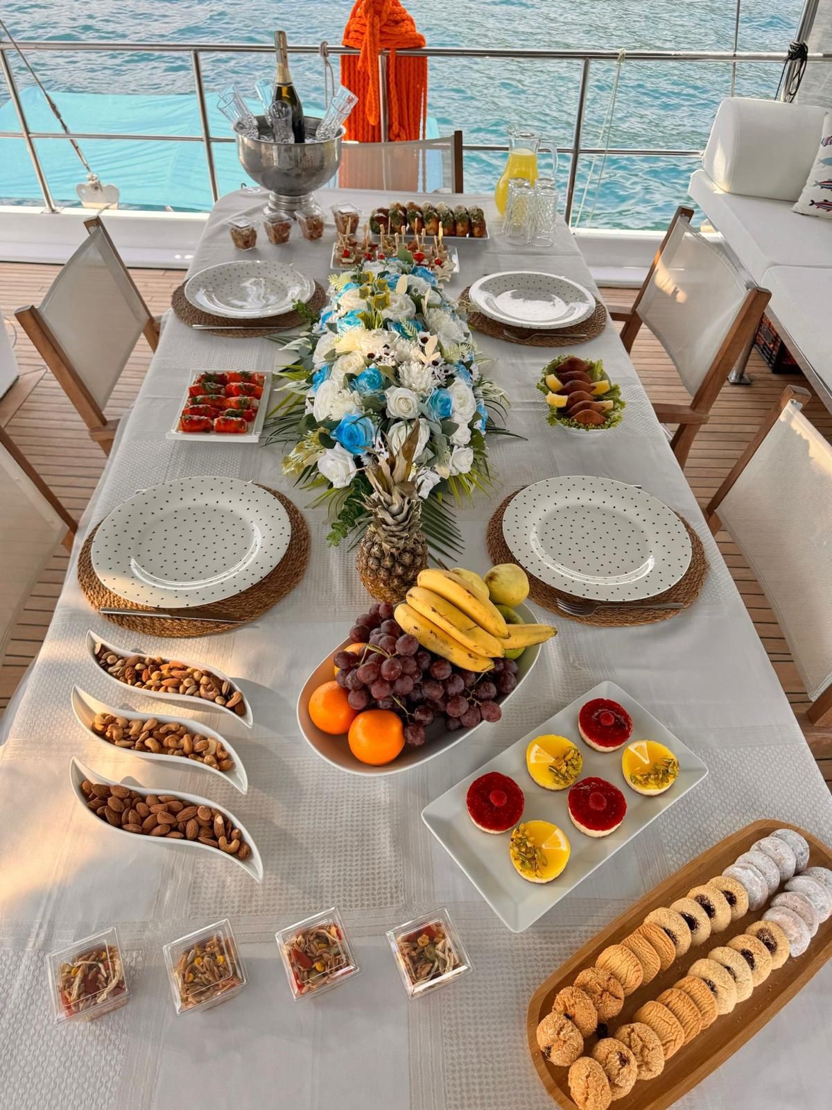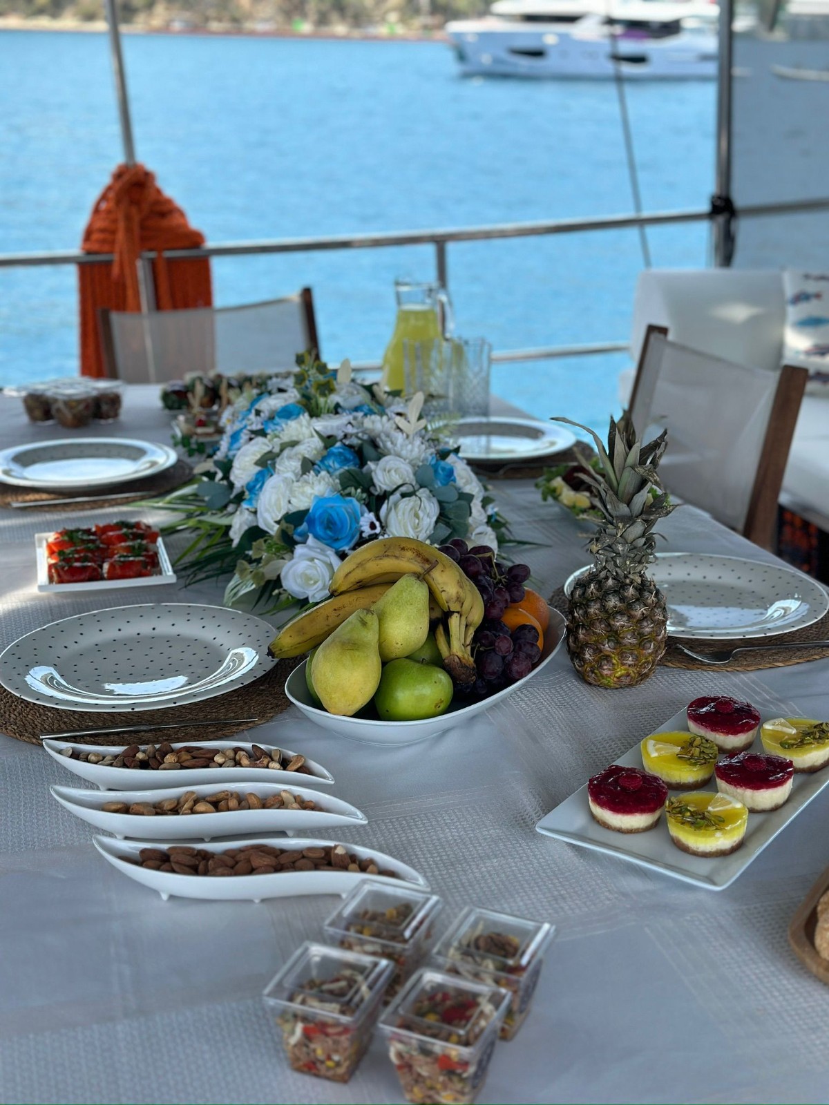 Misafirlerimize gün boyu farklı atmosferler sunabilmek adına teknemizde ön loca, flybridge, arka loca ve deniz üstü kıç oturma alanı gibi birçok sosyal alan bulunmaktadır. Modern donanımlarımız arasında sınırsız internet erişimi, filtre kahve ve espresso kapsül makineleri ile buz makinesi gibi konfor artırıcı unsurlar yer almaktadır. Deniz aktivitelerini seven misafirlerimiz için kanolar, paddle boardlar ve çeşitli deniz gereçleri teknemizde kullanıma hazır durumdadır.