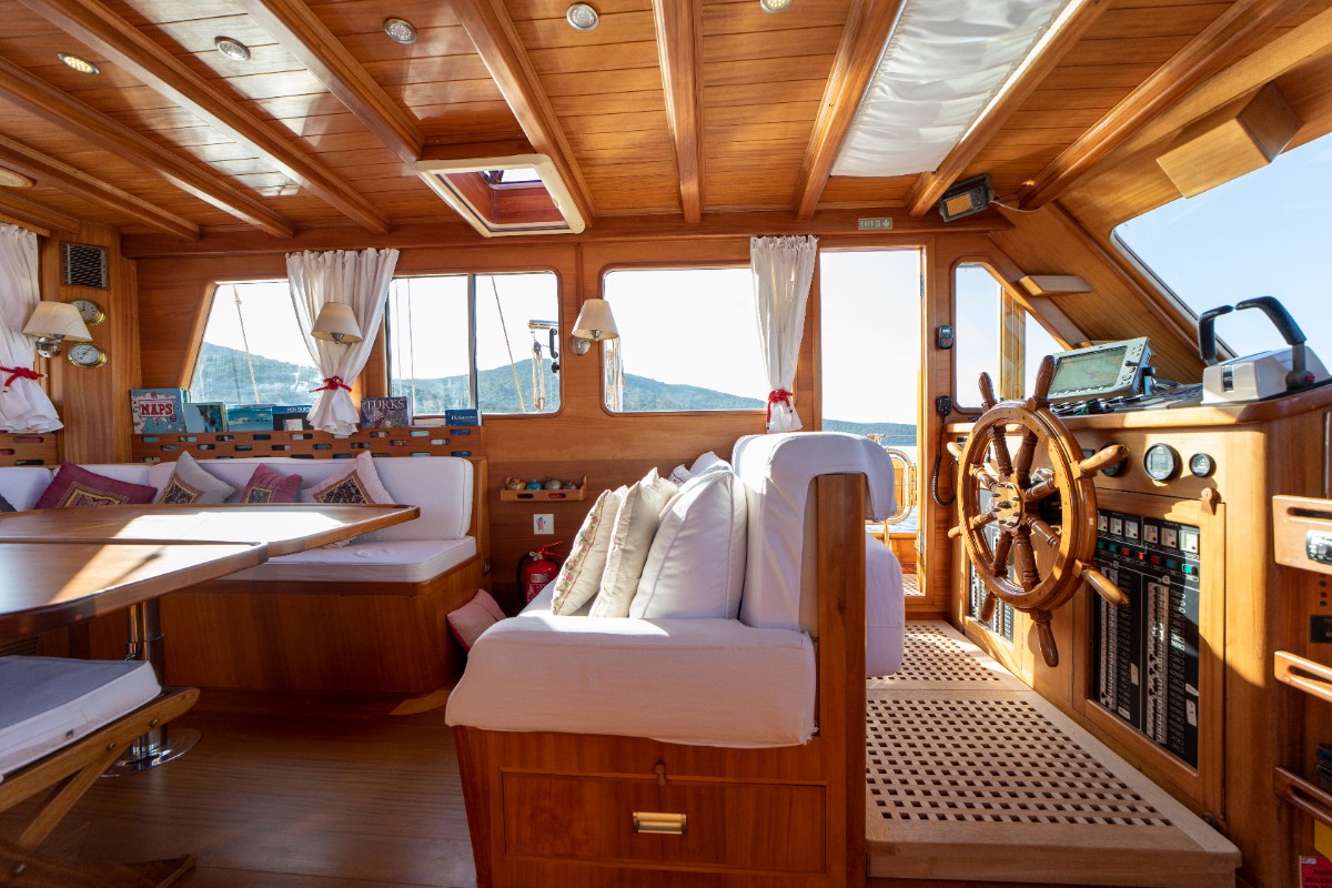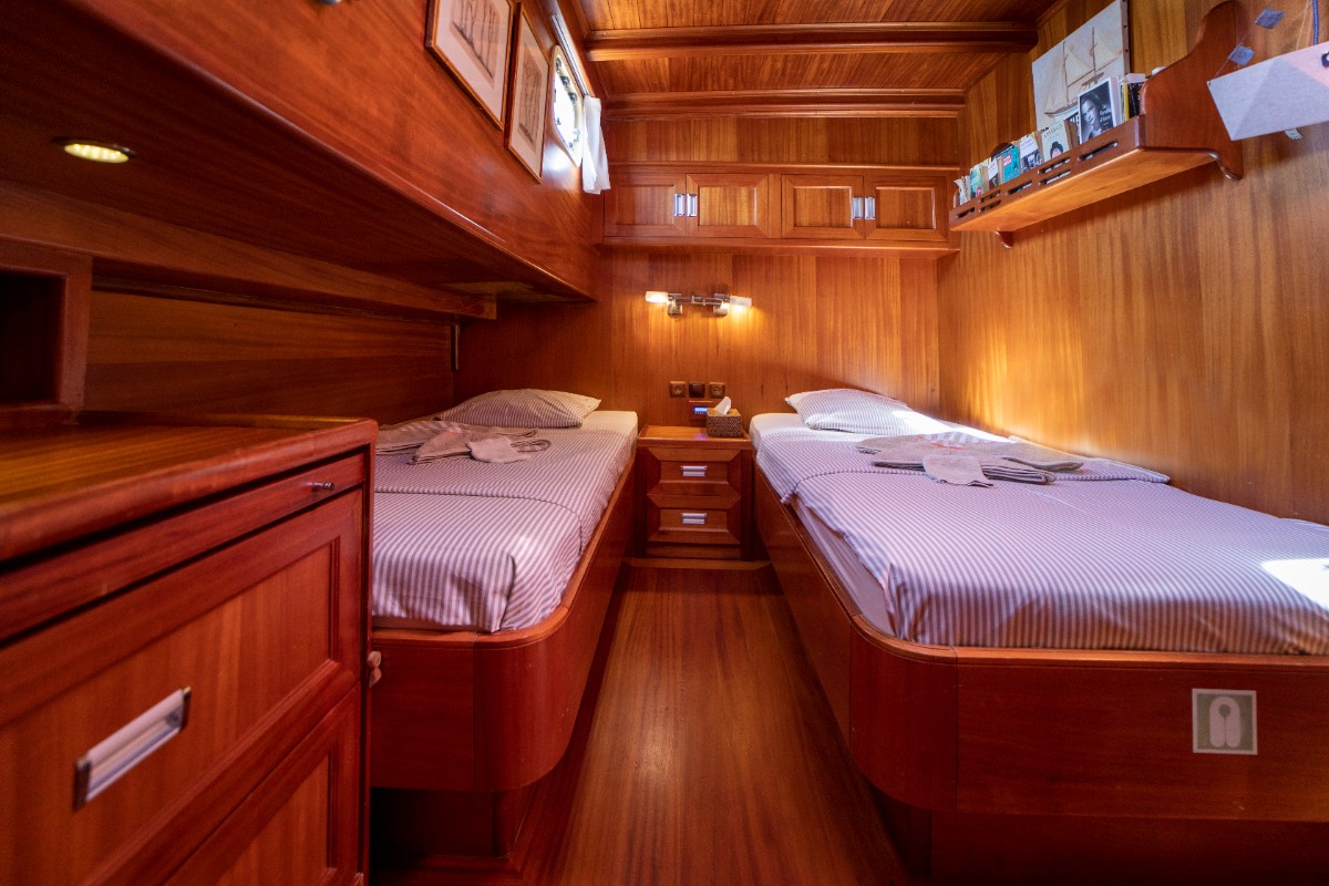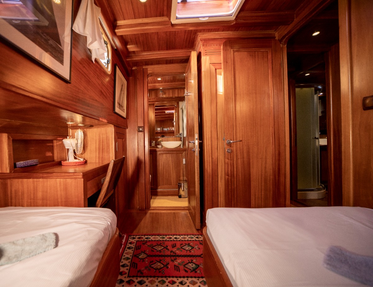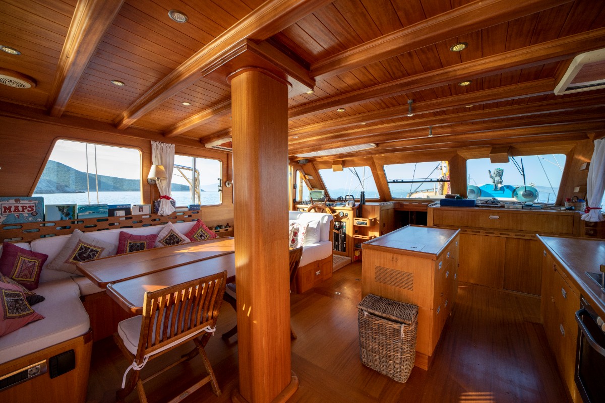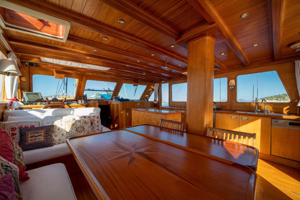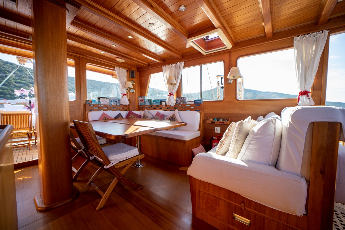 The gulet accommodates up to 6 guests in 3 spacious en-suite cabins, consisting of 1 master cabin and 2 twin cabins. Each cabin has its own private bathroom, ensuring privacy and comfort for guests. The interior features a classic furnished salon with a dining table and comfortable seating area, along with a fully equipped kitchen, creating a relaxed and welcoming environment for a private yacht charter experience.