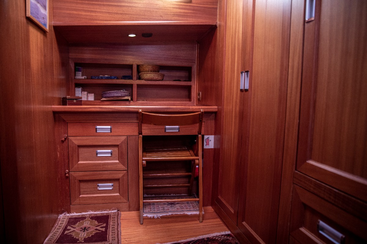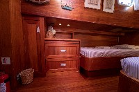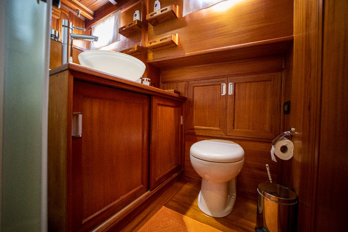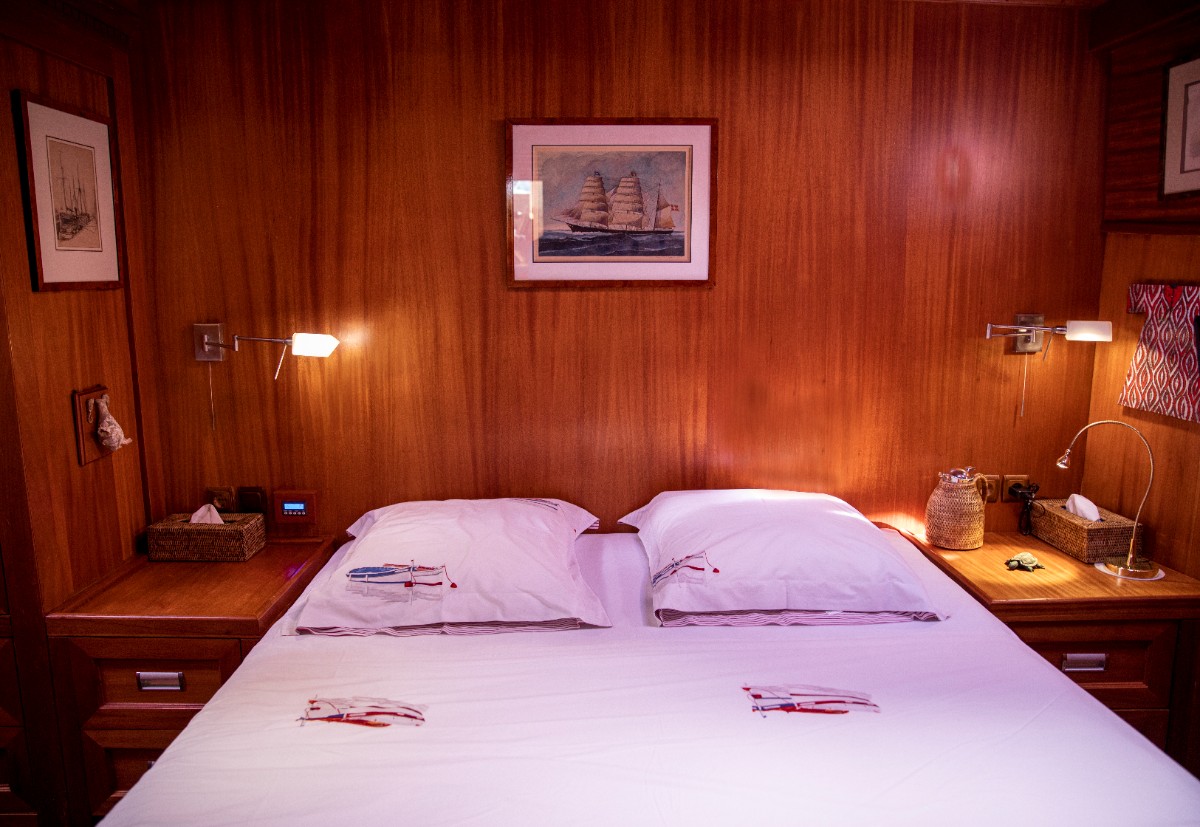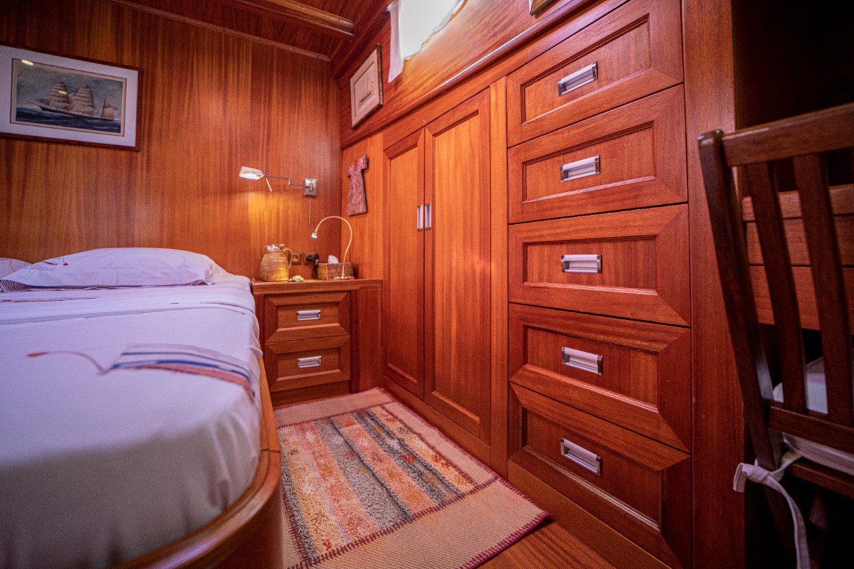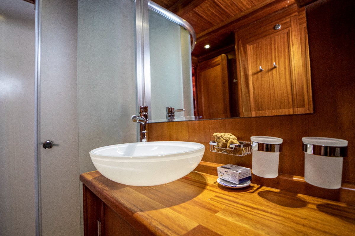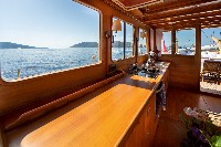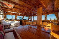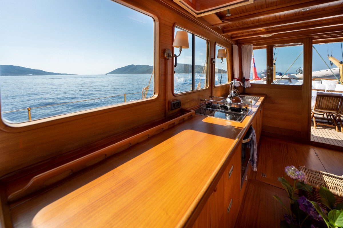 The gulet accommodates up to 6 guests in 3 spacious en-suite cabins, consisting of 1 master cabin and 2 twin cabins. Each cabin has its own private bathroom, ensuring privacy and comfort for guests. The interior features a classic furnished salon with a dining table and comfortable seating area, along with a fully equipped kitchen, creating a relaxed and welcoming environment for a private yacht charter experience.