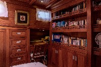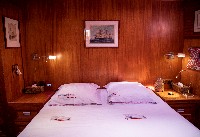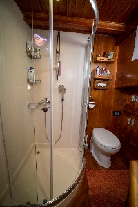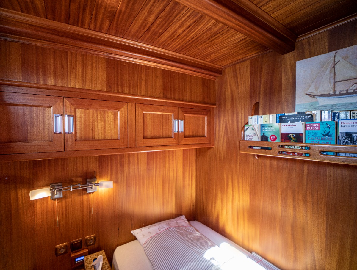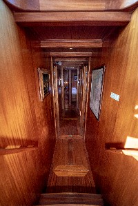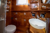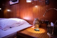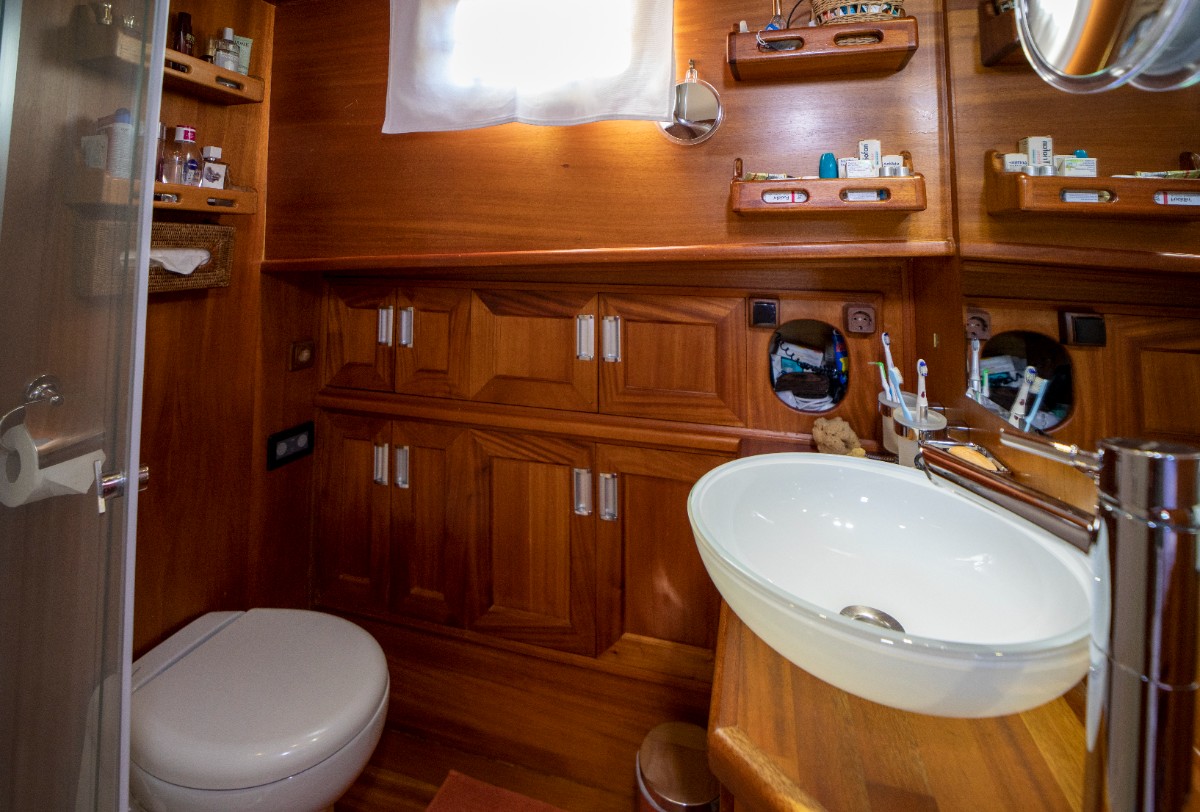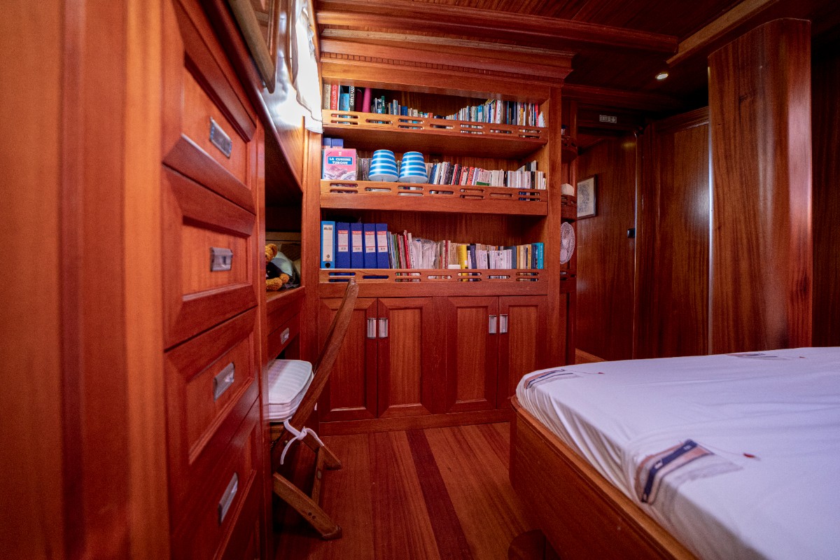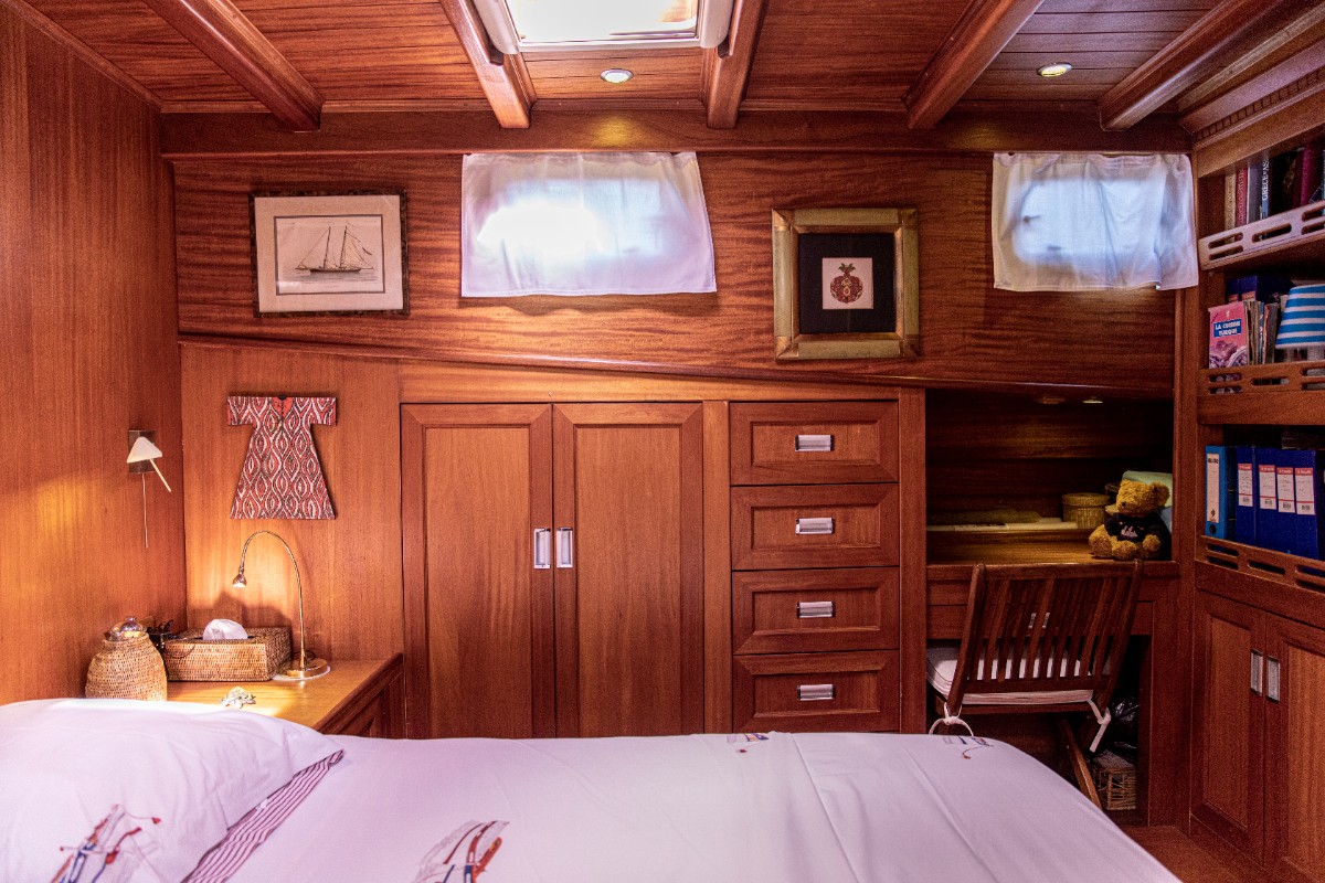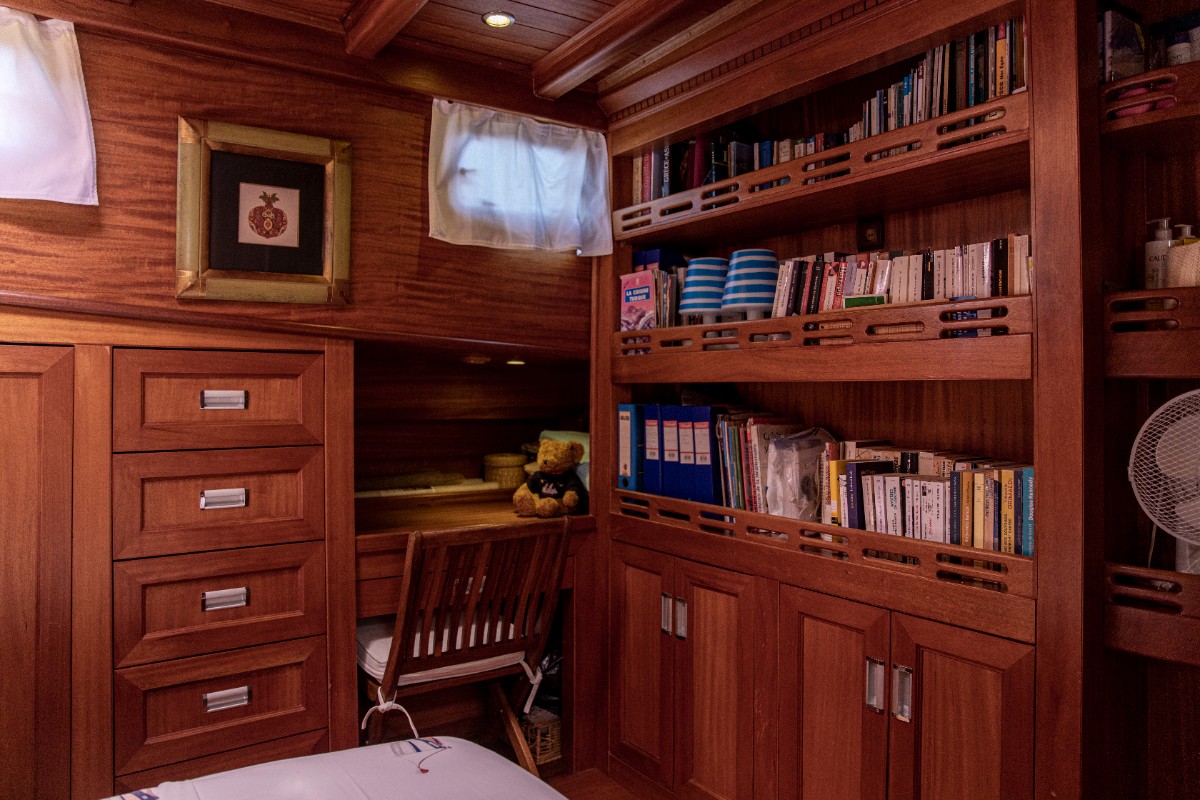 The gulet accommodates up to 6 guests in 3 spacious en-suite cabins, consisting of 1 master cabin and 2 twin cabins. Each cabin has its own private bathroom, ensuring privacy and comfort for guests. The interior features a classic furnished salon with a dining table and comfortable seating area, along with a fully equipped kitchen, creating a relaxed and welcoming environment for a private yacht charter experience.