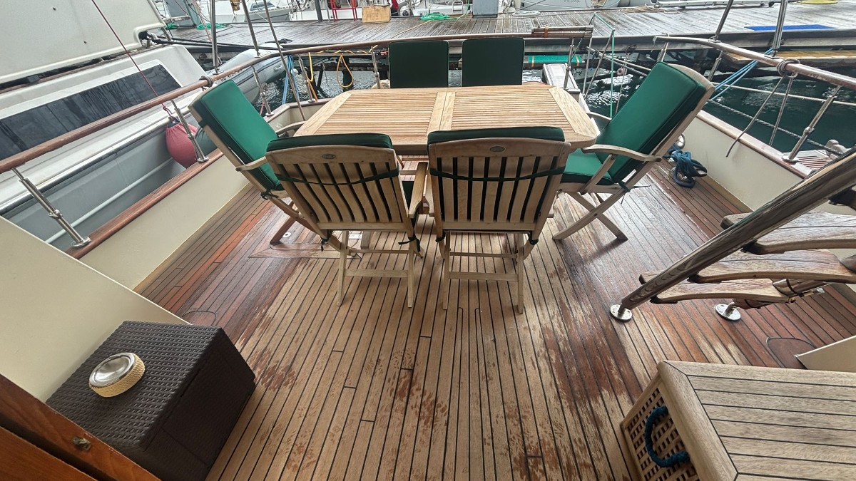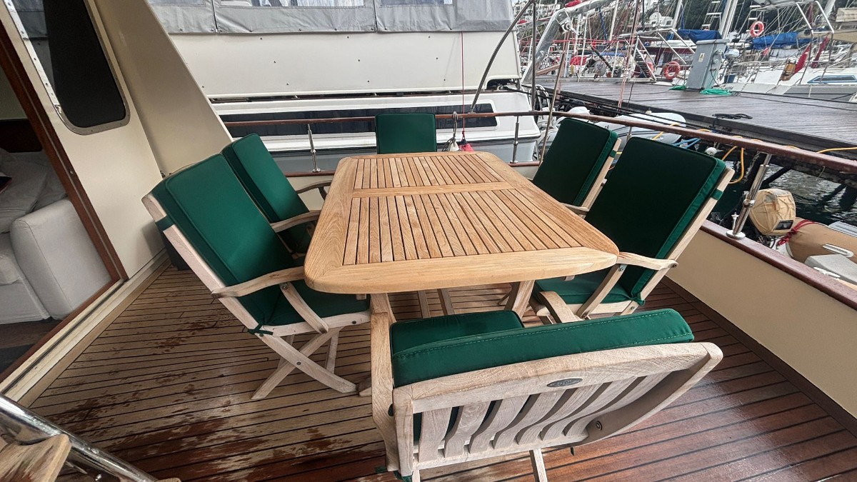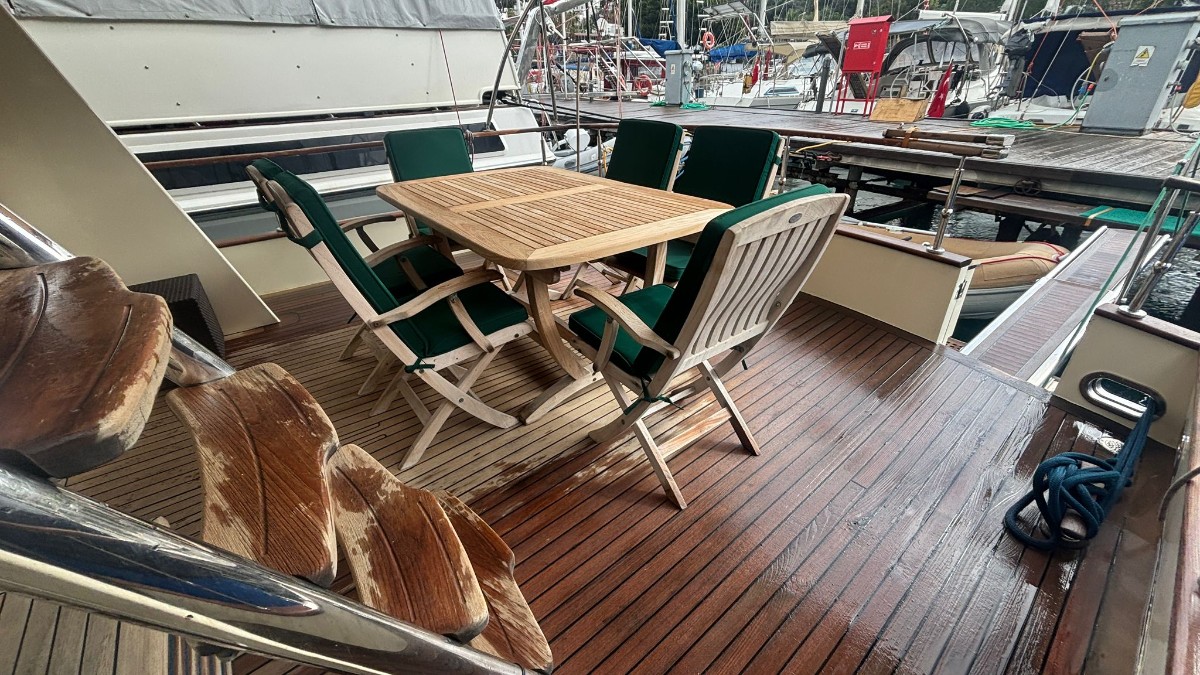 - Teak table for 6-8 people, teak chairs with armrests, 2x100W speakers, 2nd helm station, table for 6 people, half hardtop/openable awning, 2x100W Bose speakers, electric grill, wet bar, Vitrofrigo refrigerator