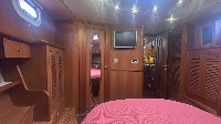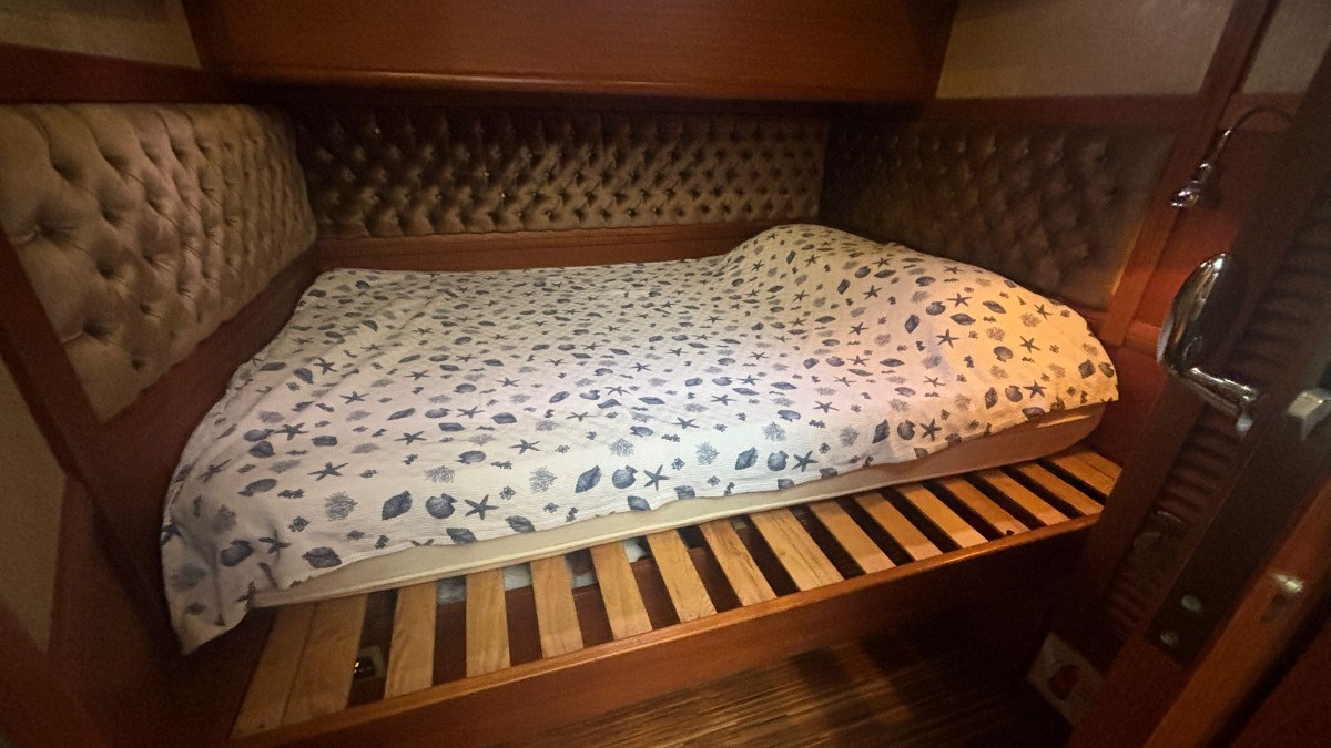 -1 Master Cabin (King size bed, spacious wardrobes, ensuite bathroom), 1 Guest Cabin (Double bed), separate crew cabin 1. Helm station, comfortable seating for 3 people/Double pull-out bed, TV, music entertainment system, work desk, library.