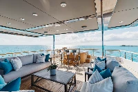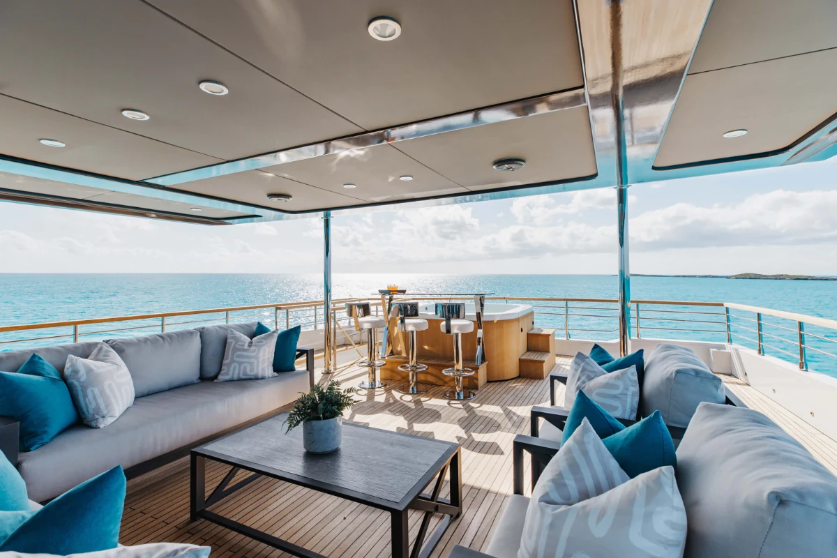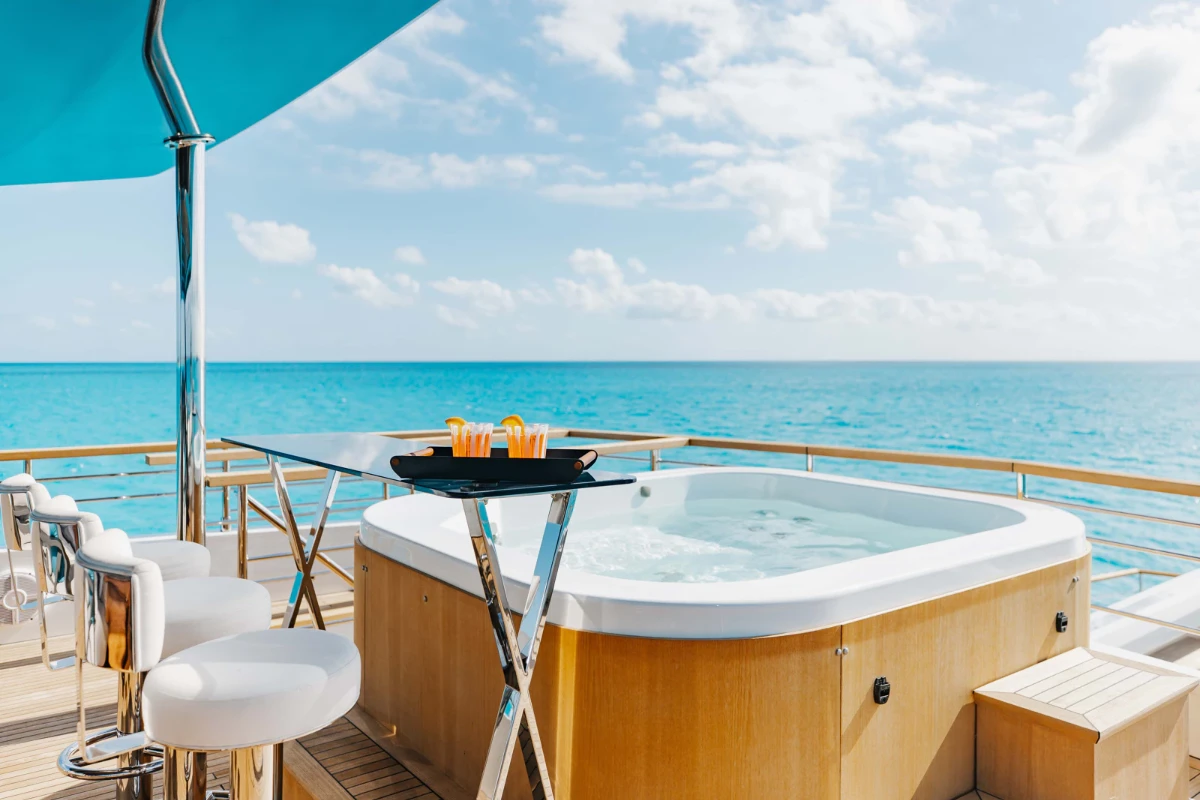 Amore’s design emphasizes spacious outdoor living and entertainment, featuring a sun deck with Jacuzzi, exterior bar, sunpads, swimming platform and a dedicated beach club for effortless access to the sea. Enjoy social gatherings, alfresco dining and panoramic views in style.