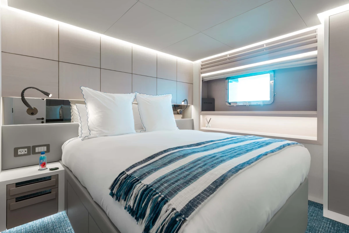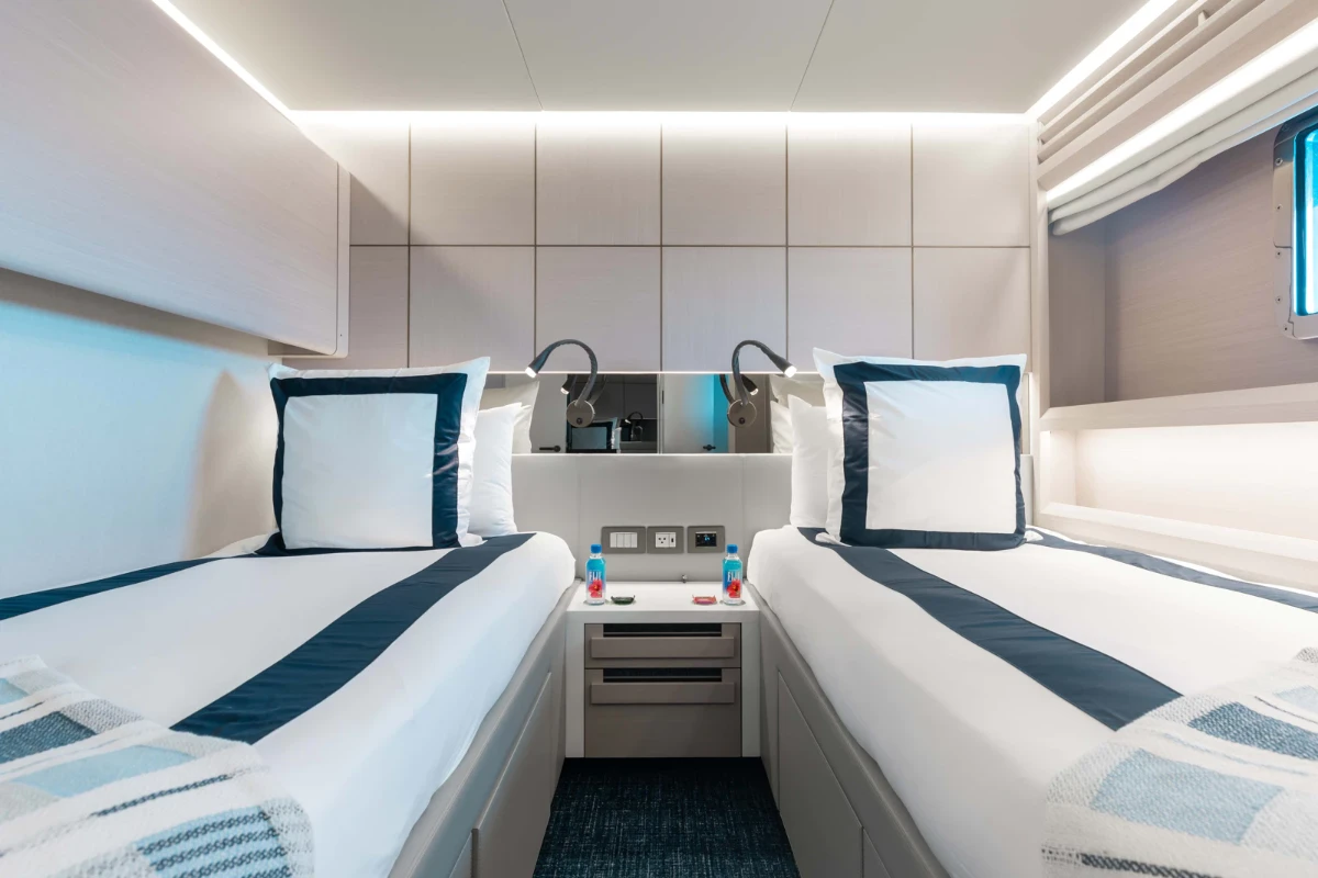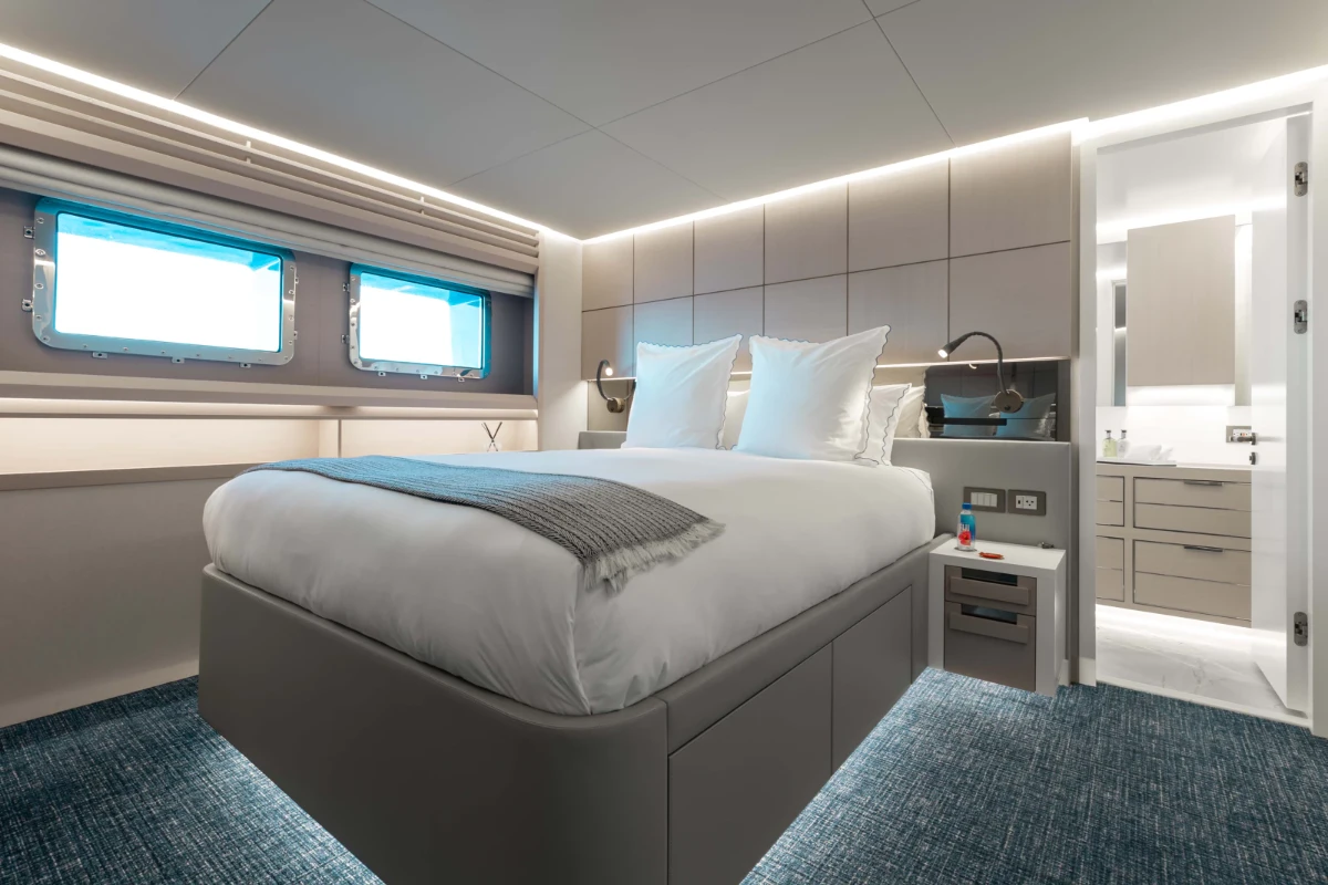 Powered by twin Caterpillar engines, she cruises at approx. 12 knots with a range of up to 6,000 nm, ideal for extended itineraries worldwide.